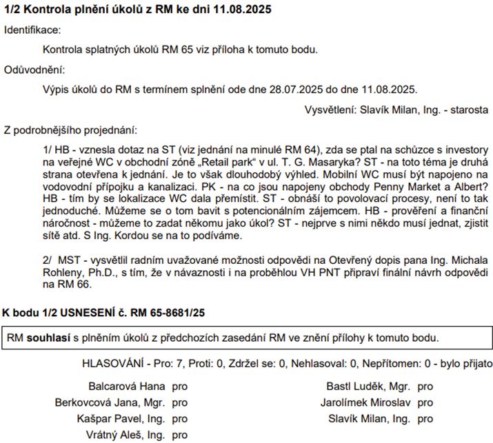 Kontrola plnění úkolů: Zajímavá diskuze u bodu 1 – veřejné WC u retailparku, ze které je patrné, že tento záměr není jednoznačně mezi prioritami vedení města.