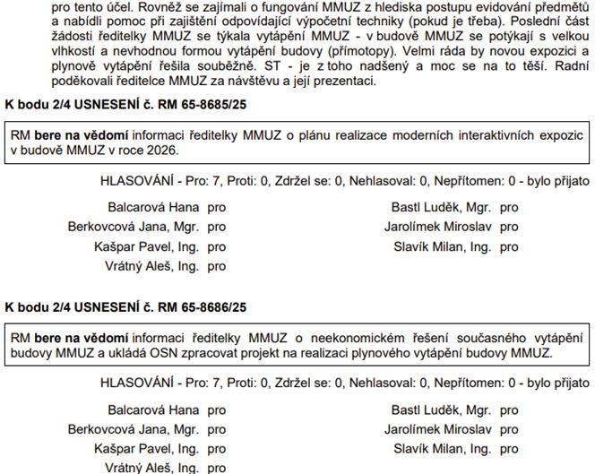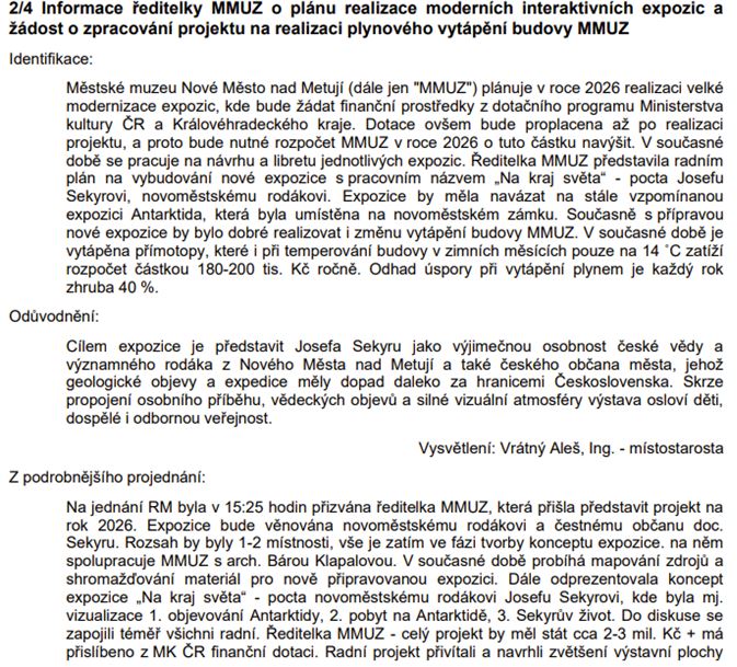 Radě města byla předložena úprava rozpočtu, tedy jeho navýšení, pro tyto projekty: Park v bývalém areálu kasáren, úprava Urnového háje a studie Sídelní zeleně. Klademe si otázku: proč jsou nutná rozpočtová opatření u tolika projektů? Městské muzeum chystá realizaci moderních interaktivních expozic – už se těšíme.