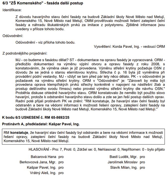 Fasáda ZŠ Komenského: z bodu není jasné, jak se bude věc dále vyvíjet. Budeme sledovat.