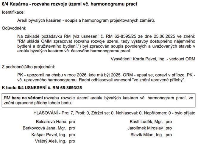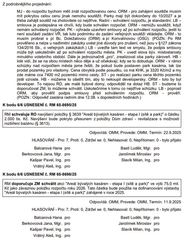 Kasárna – rozvaha rozvoje území vč. harmonogramu prací: občany by záležitost jistě velmi zajímala, nicméně ze zápisu se veřejnost nezvídá naprosto nic. Rozvoj města považujeme za důležitý zájem občanů města, který by se neměl odehrávat za zavřenými dveřmi.
