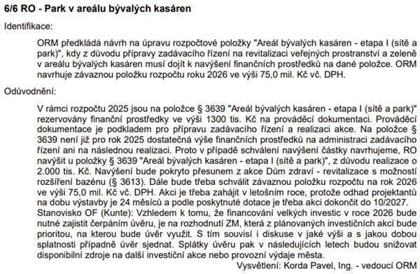 Rozpočtové opatření – Park v areálu bývalých kasáren: další nepředpokládaná (?!) investice v nemalé výši.
