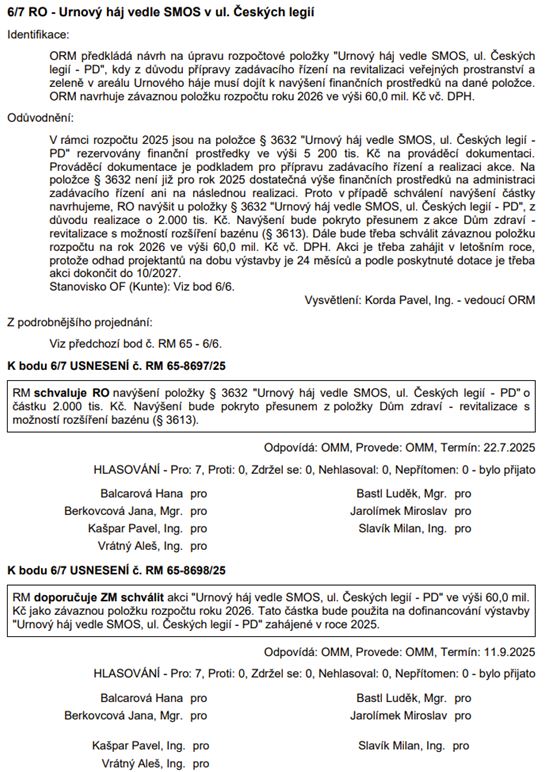 Rozpočtové opatření – Urnový háj vedle smuteční síně v ul. Českých legií: zcela obdobný bod a můžeme se ptát: Proč je nutné tyto věci řešit nesystémovými rozpočtovými opatřeními?! Může mít občan v tomto světle důvěru v rozpočtovou zodpovědnost vedení města? Má vedení města zpracovaný střednědobý výhled všech investic a tedy podklad prokazující, že všechny současné investice jsou pro městský rozpočet udržitelný?