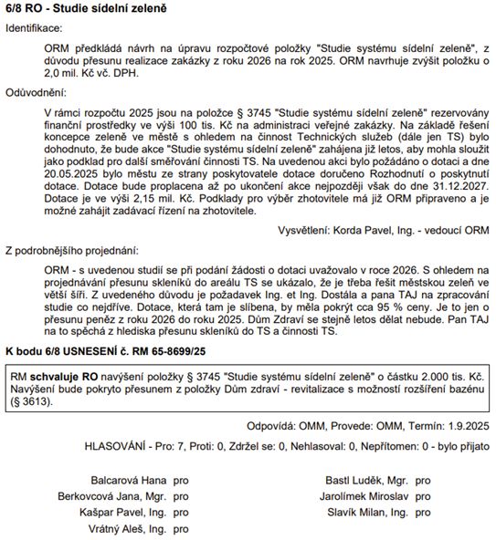Rozpočtové opatření – Studie sídelní zeleně: další nesystémové řešení městských financí v rámci jednoho jednání Rady města! Nutno doplnit, že všemi těmito rozpočtovými opatření se spotřebovávají finance na plánovanou revitalizaci Domu zdraví, který tedy zjevně pro současné vedení není prioritou, ale ani reálně plánovanou investicí.