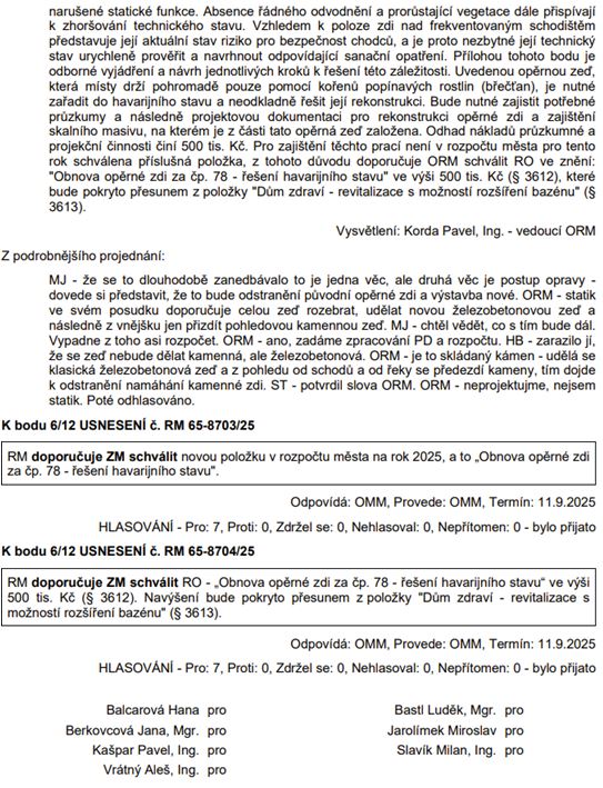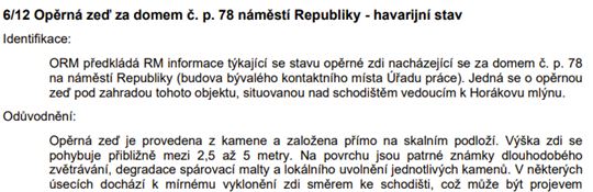 Opěrná zeď za domem č. p. 78 náměstí Republiky – havarijní stav: nutnost další investice, se kterou se nepočítalo. Jednoznačně souhlasíme s rozhodnutím Rady města věc řešit.