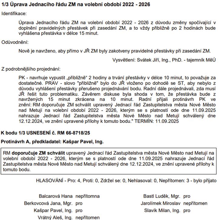 Úprava Jednacího řádu ZM: Po každých 2 hodinách bude vždy 10 min. přestávka.