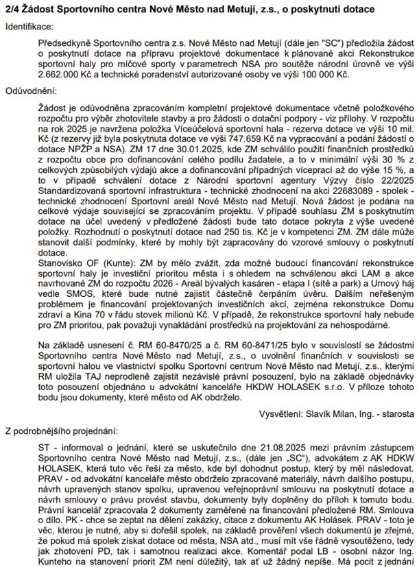 Žádost Sportovního centra Nové Město nad Metují, z.s., o