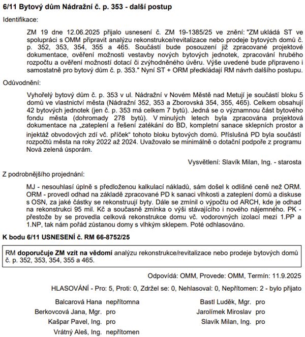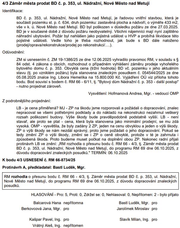 Záměr města prodat BD č. p. 353, ul. Nádražní: Bod přesunut, ale pečlivě sledujeme.