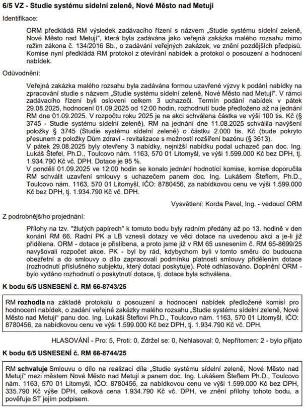 Veřejná zakázka – Studie systému sídelní zeleně: Kvitujeme tento postup vedení města, bod budeme sledovat a věříme, že studie přispěje ke zvýšení kvality veřejných prostorů ve městě.