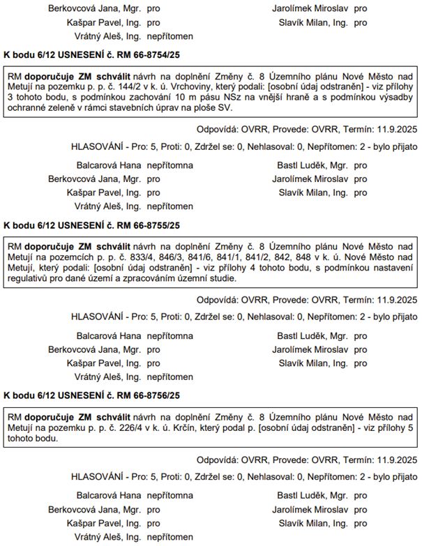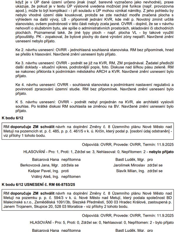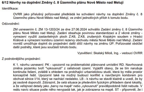 Návrhy na doplnění Změny č. 8 územního plánu: postup pořizovatele nepovažujeme za příliš efektivní a máme obavy o neprojednatelnosti této změny. Zaujalo nás naprosto nepochopitelné vyjádření radního L. Bastla k bodu 1. Jako zásadní skutečnost vznášíme náš názor, že ve skutečnosti projednané a schválené zadání Změny č. 8 nedovoluje takovéto libovolné přidávání jakýchkoliv a zejména těch nekoncepčních podnětů do návrhu změny. Žel nic konkrétního se v této důležité věci týkající se rozvoje města veřejnost nedozvídá.