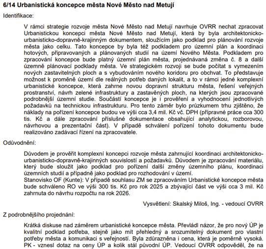 Urbanistická koncepce města Nové Město nad Metují: naprosto nerozumíme postupu OVRR, vybočujícímu z jeho zákonem daných kompetencí. Stavební zákon nic takového jako urbanistická koncepce nezná a OVRR zde proto nemá žádné zákonné zmocnění. Připomínáme, že OVRR vykonává věřejnou správu čistě v přenesené působnosti (tj. veřejná správa bez jakéhokoliv vlivu samosprávy).