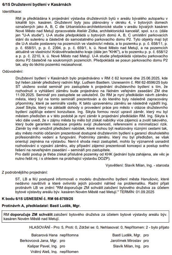 Družstevní bydlení v Kasárnách: RM doporučuje ZM schválit založení bytového družstva. Žel veřejnost neví nic o podrobnostech a tedy neví, co to znamená.