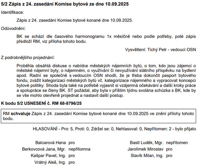 Zápis z 24. zasedání Komise bytové: Upozorňujeme na zápis projednání a kvitujeme, že RM bere vážně problematiku nutnosti tvořit a realizovat bytovou politiku města. Za nás dodáváme, že základem pro všechny její možnosti je dostatečný bytový fond.