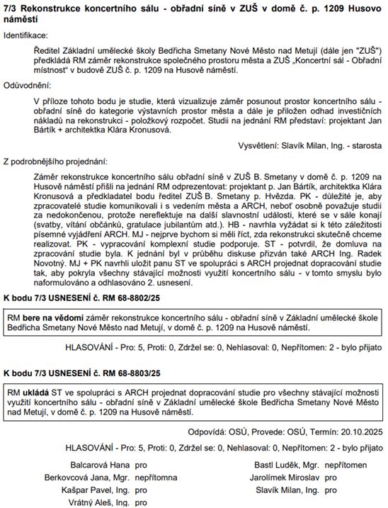 Rekonstrukce koncertního sálu – obřadní síně v ZUŠ: Postup RM kvitujeme a věříme v úspěšné dokončení záměru.