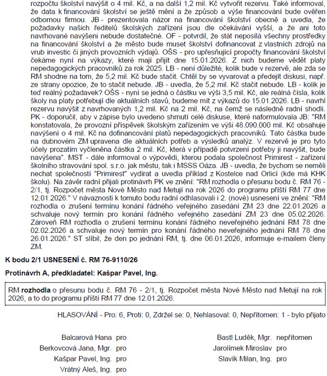 Rozpočet města Nové Město nad Metují na rok 2026: V rámci tohoto bodu došlo k posunu termínu konání jednání "rozpočtového" ZM.