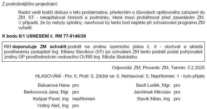Rada města doporučuje schválit Zastupitelstvu města podnět pan Zilvara ke změně územního plánu č. 9 týkající se obchvatu. Co se týká zřízení bytového družstva, tak tam je zatím vznik nejistý.