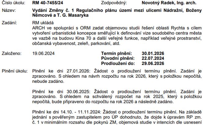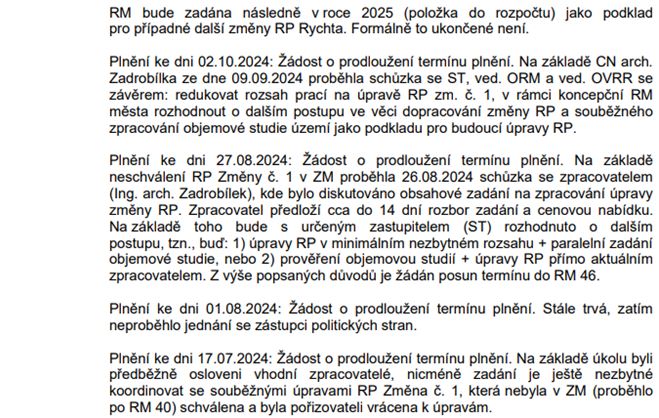 Z další mimořádného jednání rady upozorňujeme na vydání Změny č. 1 regulačního plánu "Rychta", ke kterému máme výhrady. Také pečlivě sledujeme prodej městských pozemků nebo revitalizaci veřejných prostranství.