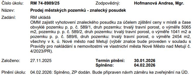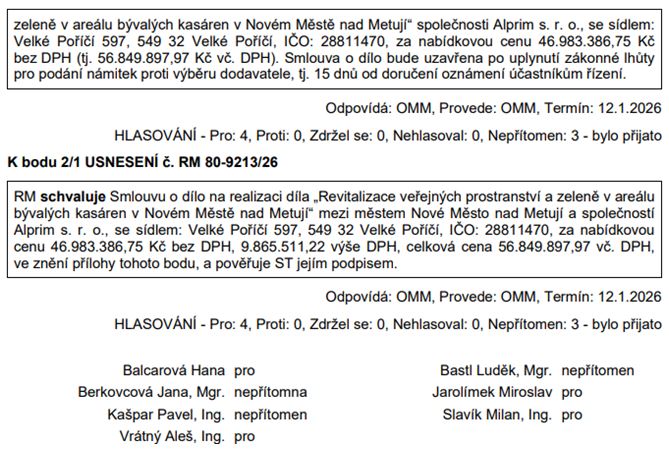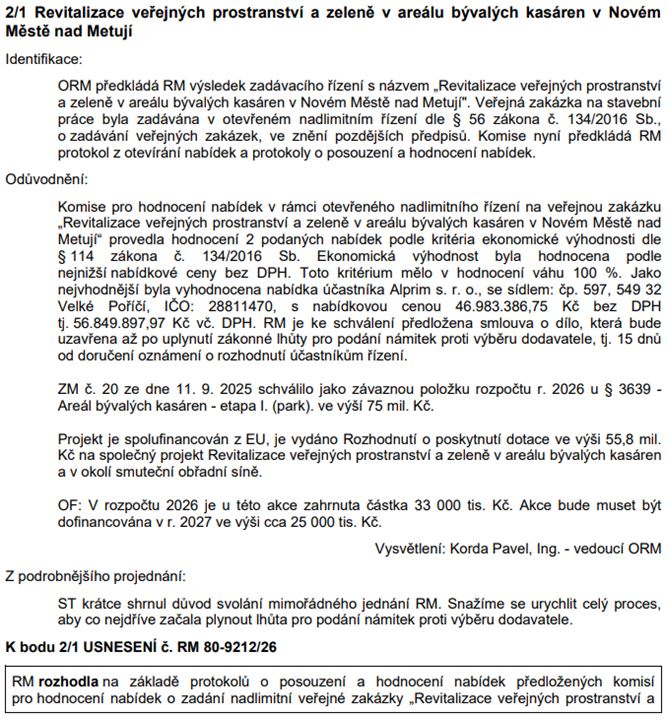 Revitalizace veřejných prostranství a zeleně v areálu bývalých kasáren v Novém Městě nad Metují: RM odsouhlasila zadání zakázky i přes informaci finančního odboru, že na tuto akci není v rozpočtu dostatek financí a bude nutné jej doinvestovat v rozpočtu na rok 2027 (chybějící částka je 25 mil. Kč). Doufejme, že je vše v pořádku a vratka z dotačního titulu věc narovná.