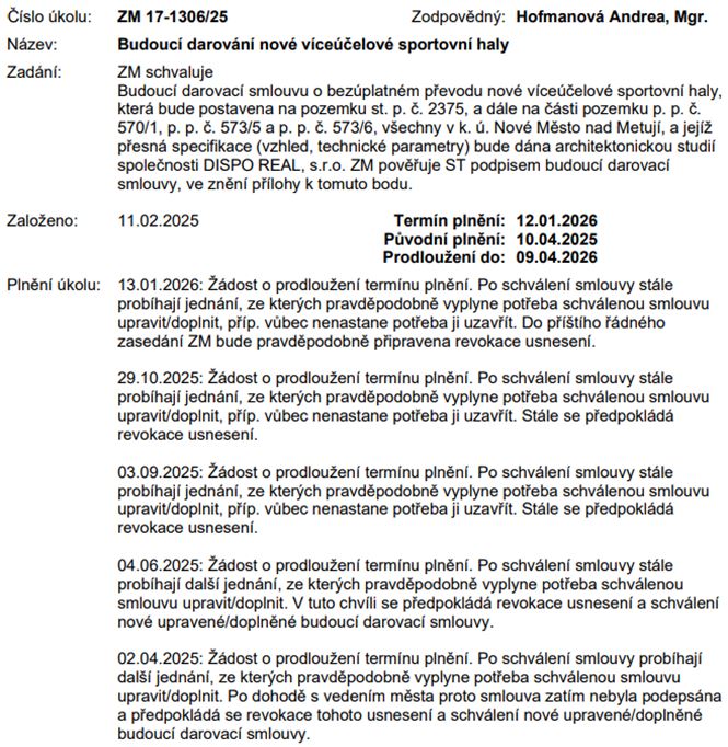 Budoucí darování nové víceúčelové sportovní haly: Již samotná historie plnění tohoto úkolu vypovídá o všem. Více bez komentáře.