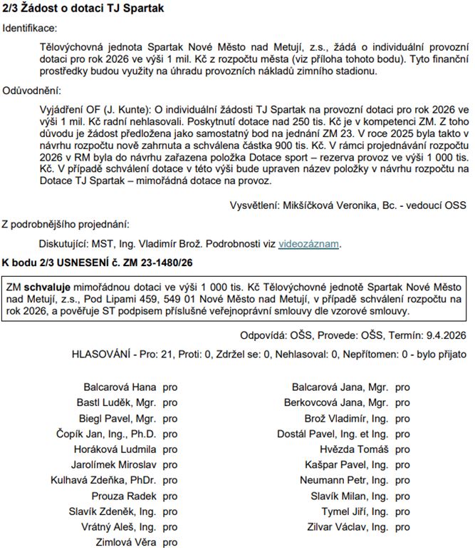 Žádost o dotaci TJ Spartak: Pouze informujeme o evidentně nutné dotaci TJ Spartak ve výši 1 mil. Kč na provoz zimního stadionu.