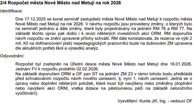 Rozpočet města Nové Město nad Metují na rok 2026: V rámci