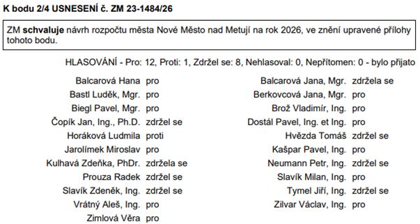usnesení (č. ZM 23-1484/26) a asi nejdůležitější usnesení roku o rozpočtu města na rok 2026 bylo