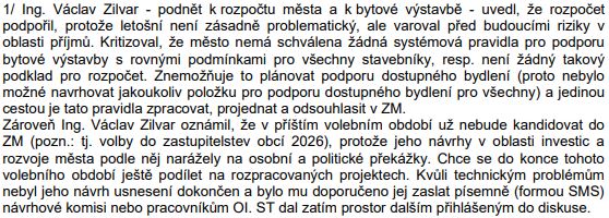 Diskuze: Doporučujeme k poslechu vystoupení zastupitele pana Ing. Zilvara, který je současně místním developerem (jeho rodina vlastní desítky tisíc metrů čtverečních zastavitelných pozemků pro výstavbu v severní části města). Jeho snahy vnímáme jako velmi problematické. Na druhou stranu z mnoha důvodů vítáme jeho rozhodnutí v příštím volebním období již nekandidovat.