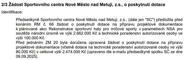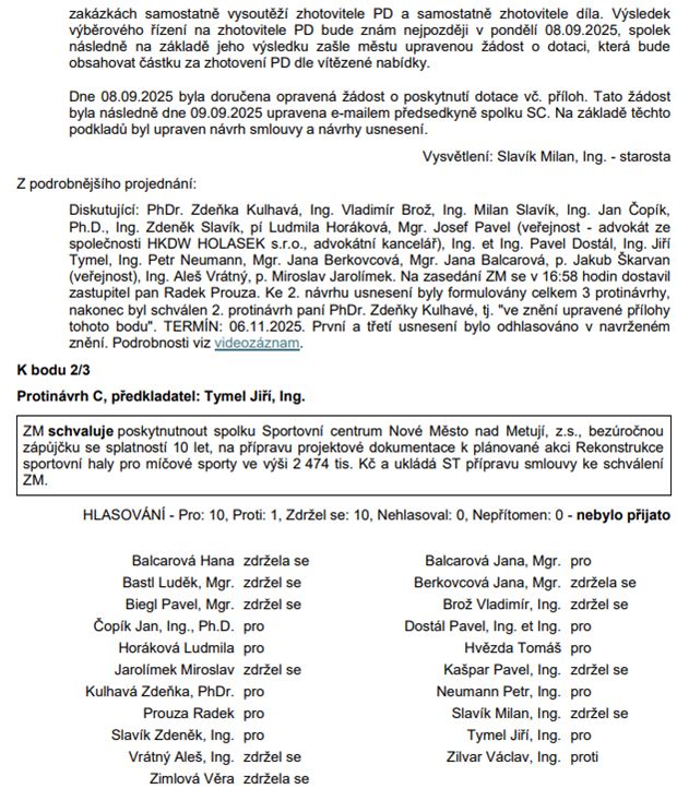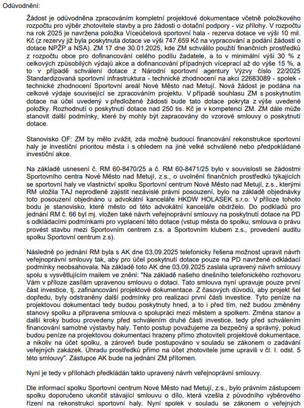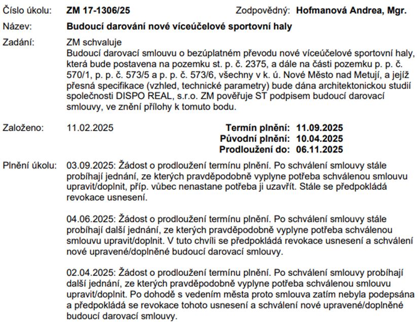 Budoucí darování nové víceúčelové sportovní haly: Úkol byl založen již 11. 2. 2025 a z plnění úkolu je zřejmé, že se u takto zásadní věci jednalo uspěchaně, nepromyšleně, nekoncepčně.