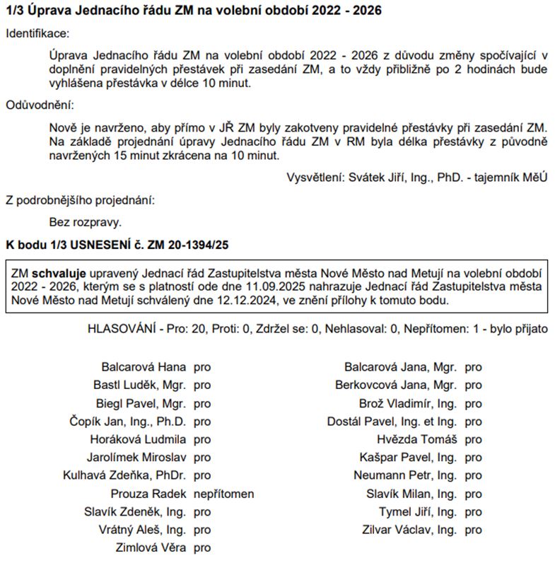 Z pohledu občana, ale i z pohledu manažerského, zcela nepřijatelné řešení. Úprava Jednacího řádu ZM na volební období 2022 - 2026: Nově bude v průběhu jednání zařazena každé 2 hodiny 10 minutová přestávka.