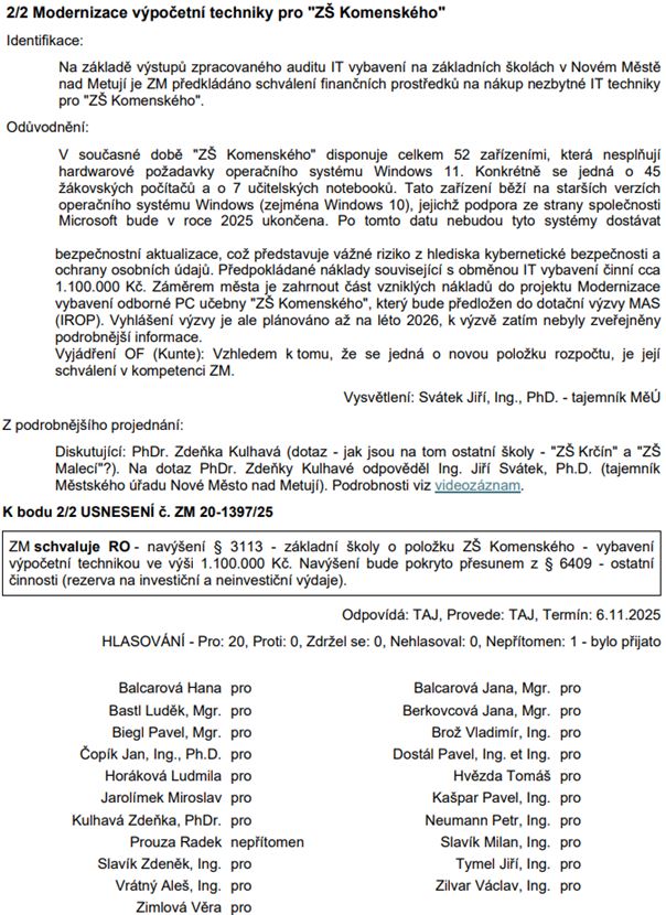 Modernizace výpočetní techniky pro "ZŠ Komenského": Kvitujeme rozhodnutí ZM, s postupnou obměnou vybavení se musí počítat i u výpočetní techniky.