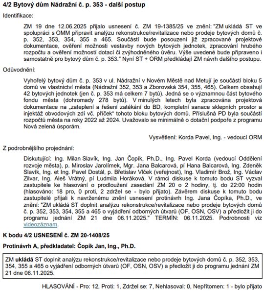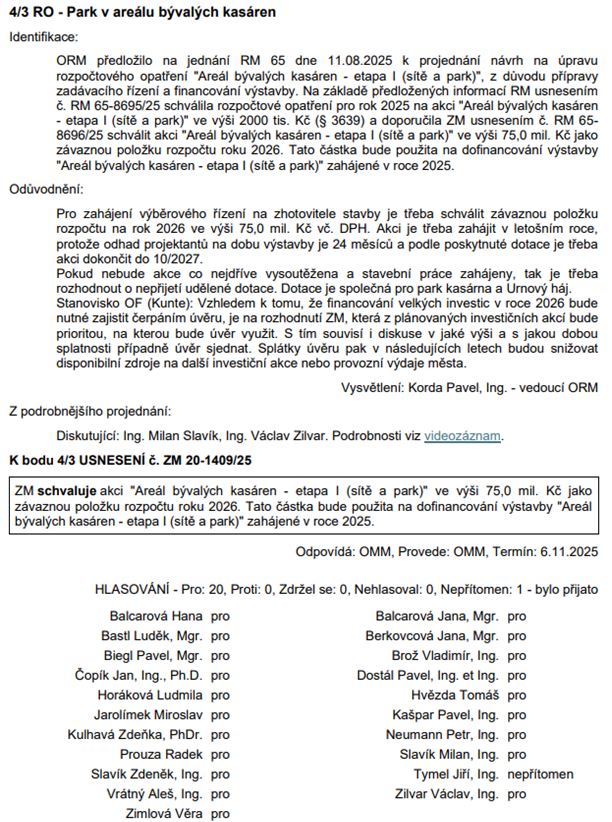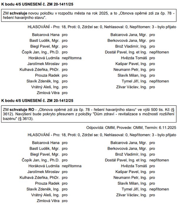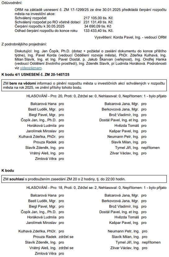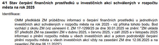 Stav čerpání finančních prostředků u investičních akcí schválených v rozpočtu města na rok 2025: V zápisu nenápadný bod, nicméně doporučujeme poslech záznamu.