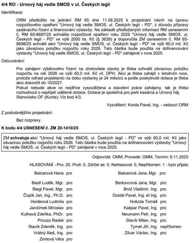 Rozpočtové opatření – urnový háj vedle SMOS (smuteční síň) v ul. Českých legií: Kvitujeme toho rozhodnutí ZM ve věci důležité a skutečně potřebné investice města, nicméně i zde je důrazně upozorňujeme, že se tím již nyní zasahuje do rozpočtu na příští rok.