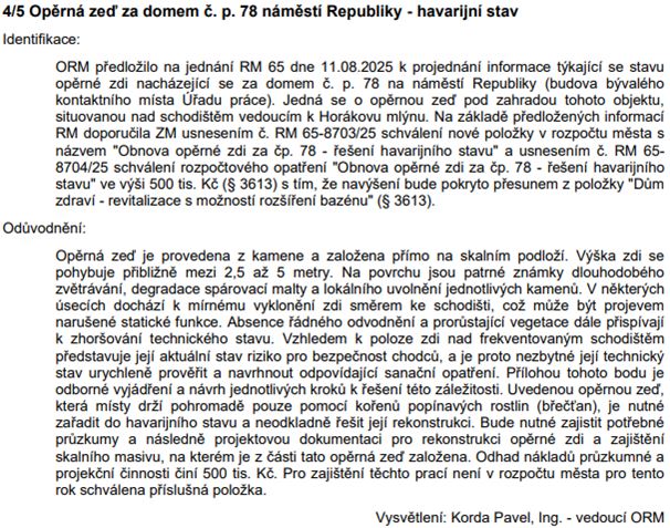 Opěrná zeď za domem č. p. 78 náměstí Republiky – havarijní stav: Jistě nutné řešení havarijního stavu, nicméně další snížení o půl milionu Korun z financí na Dům zdraví. Je zde tedy již jednoznačné, že se s revitalizací Domu zdraví nepočítá a i v příštích letech bude město muset investovat do výrazně nehospodárného provozu této technicky a tepelně nevyhovující budovy.