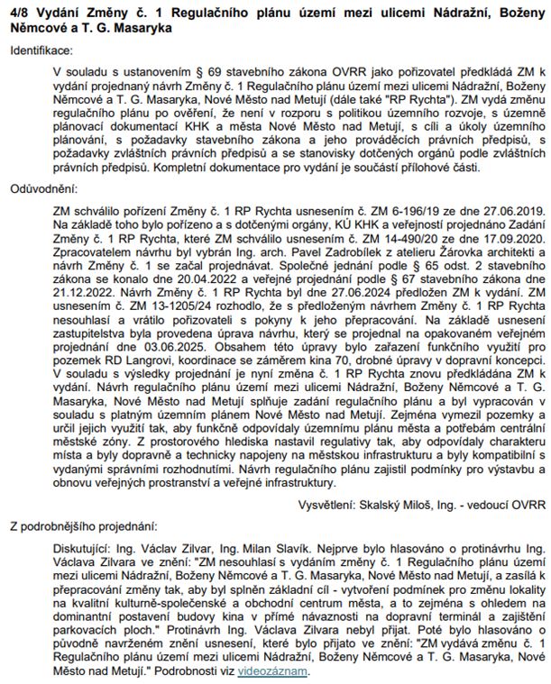Vydání Změny č. 1 Regulačního plánu území mezi ulicemi Nádražní, Boženy Němcové a T. G. Masaryka. Završení dlouhého procesu pořizování změny regulačního plánu, který se pokusili zastavit zastupitelé Ing. Zilvar a pan Bastl.