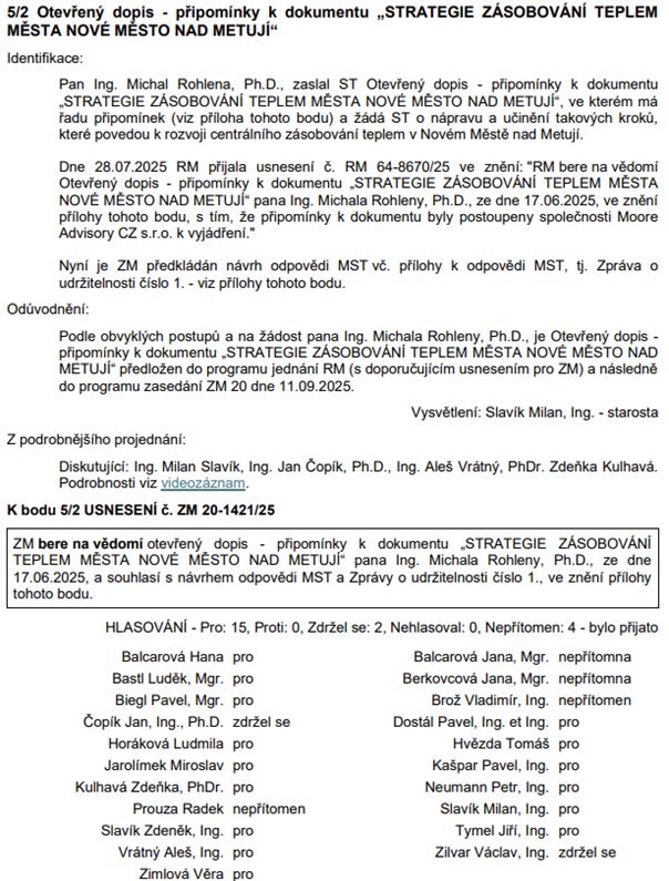 vyjádřil ke strategii zásobování teplem. ZM vzalo jeho vyjádření pouze na