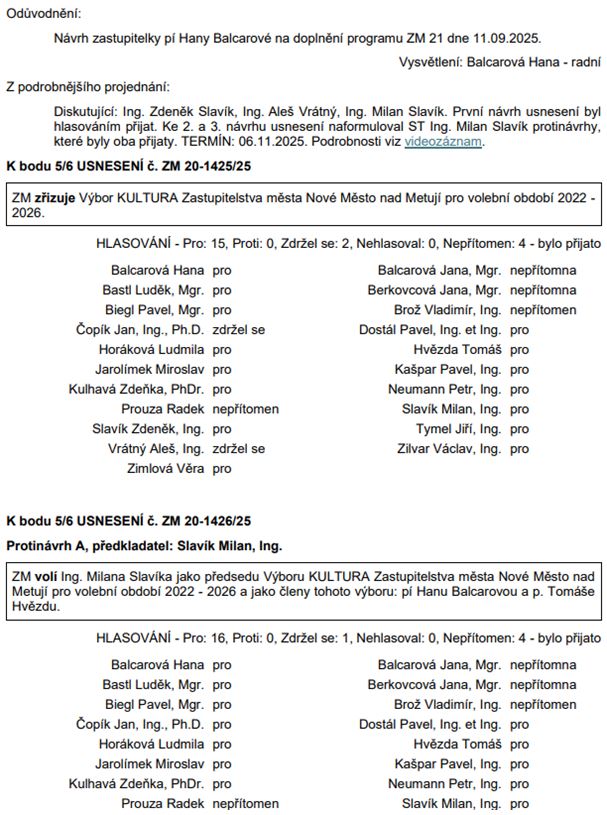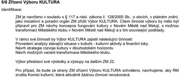 Zřízení Výboru KULTURA: ZM zřídilo nový Výbor KULTURA, jehož předsedou bude pan starosta a členy zastupitelka paní Hana Balcarová a zastupitel pan Tomáš Hvězda. Předpokladem bude dále, že RM zruší doposud nečinnou Komisi kulturní.